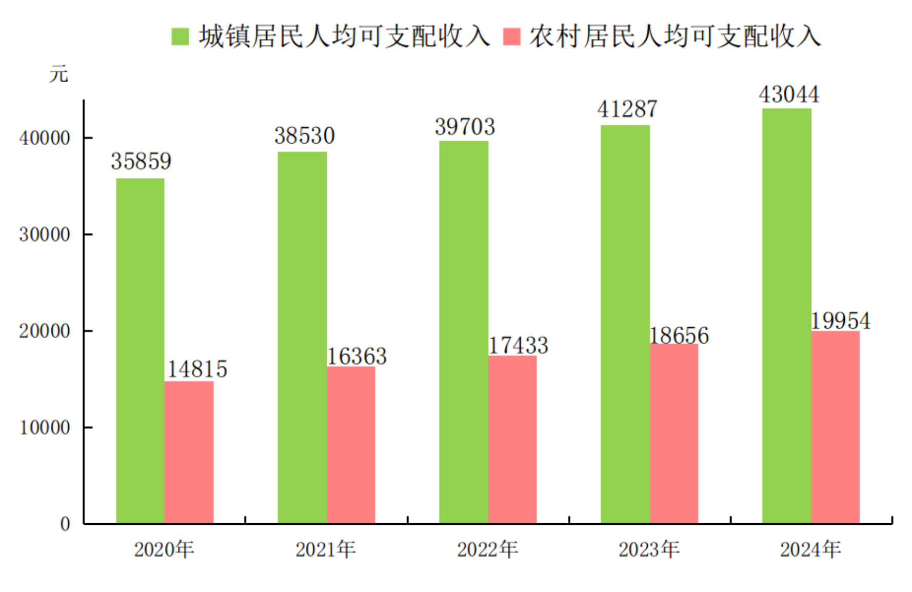 图8 2020—2024年广西城乡居民人均可支配收入