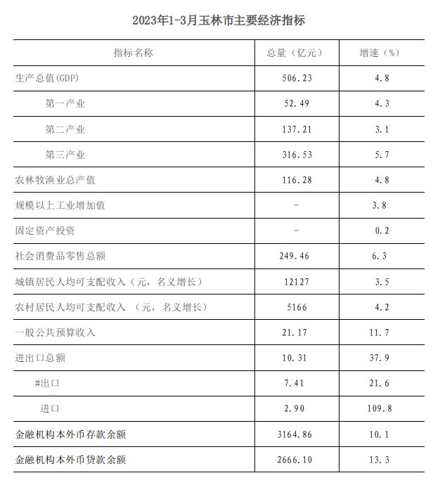 2023年1-3月玉林市主要经济指标
