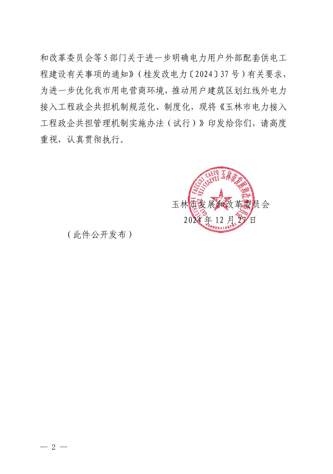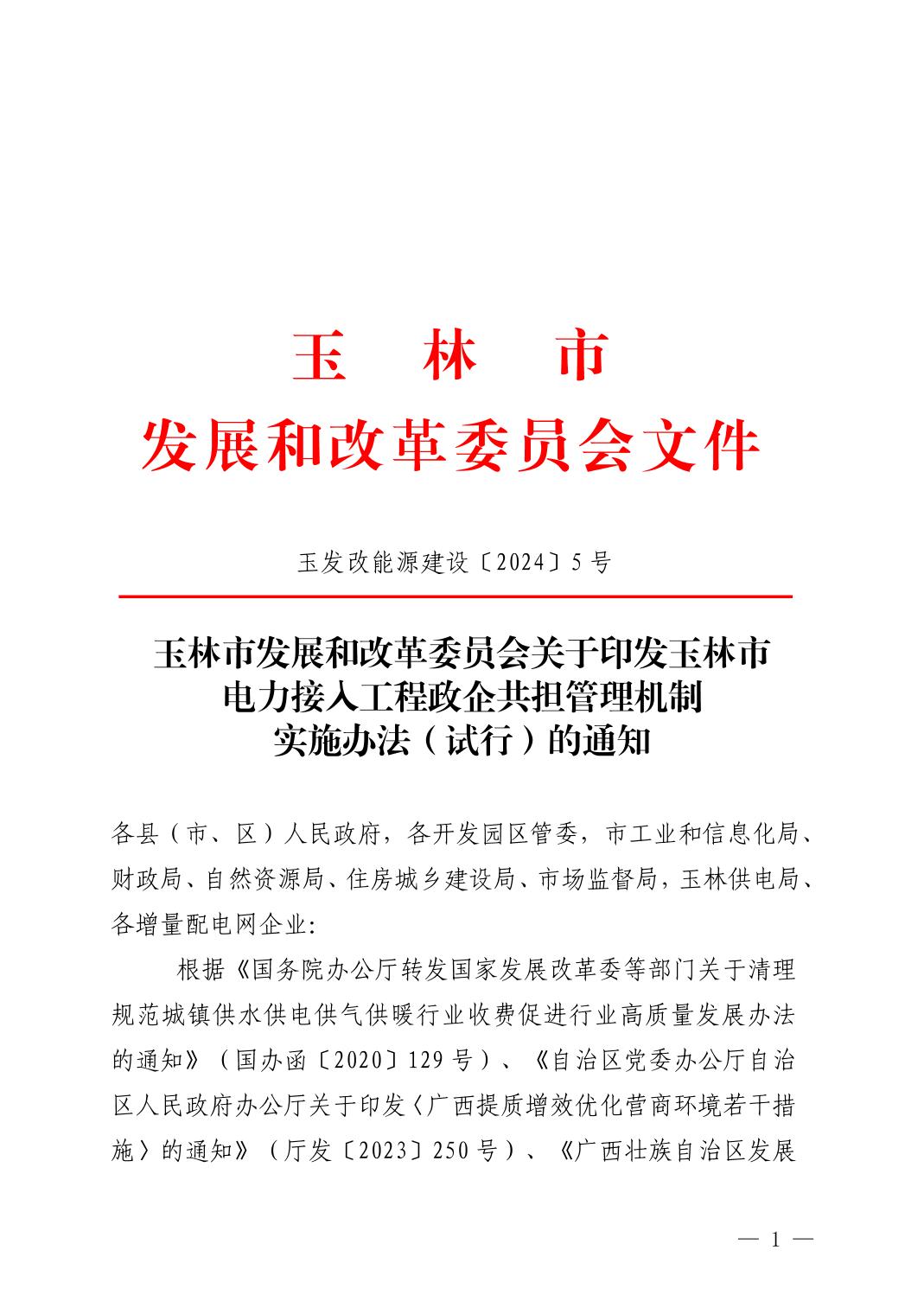玉林市发展和改革委员会关于印发玉林市电力接入工程政企共担管理机制实施办法(试行)的通知