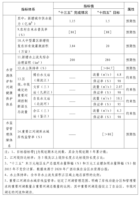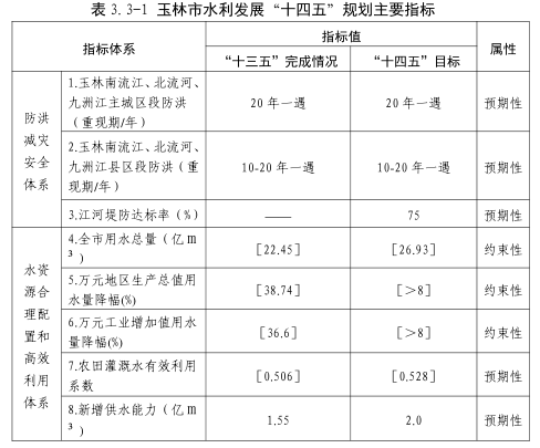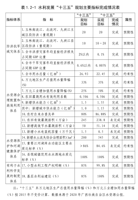 “十三五”期间玉林市开展或完成的多项重大水利工程项目,为玉林市经济社会发展提供了有力的支撑。《玉林市水利发展“十三五”规划》提出了防洪抗旱减灾、水资源合理配置和高效利用、水资源保护和河湖健康保障、水利科学发展体制改革和制度建设四类发展目标,共18个指标,其中约束性指标4个,预期性指标14个。根据玉林市水利发展现状,综合评估各类指标完成情况见表1.2-1。