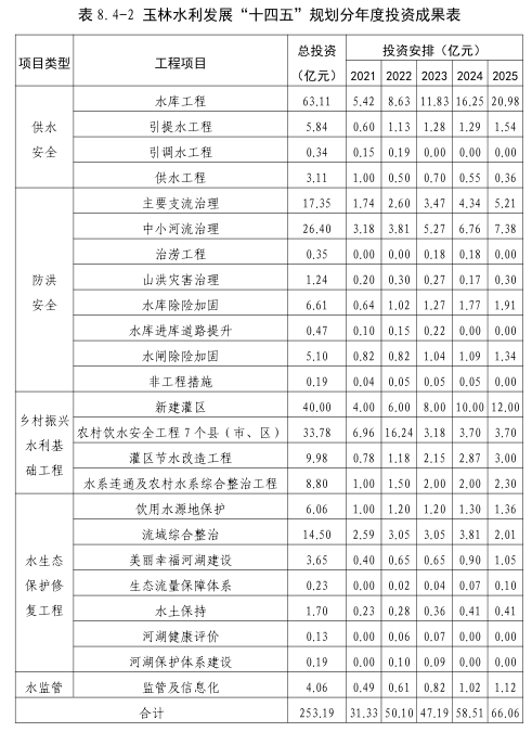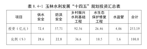 玉林市水利发展“十四五”规划项目按照类别分为供水安全、防洪安全、乡村振兴水利基础工程、水生态保护修复工程、水监管5大类,根据“十四五”期间中央和广西地方水利建设投资规模及其在建规模结转情况,以及“十四五”期间水利规划发展目标、主要建设任务和总体布局,结合玉林市的经济社会发展情况、财政收入情况、投融资情况以及分析未来可能增加的投资渠道及可能采取的投融资政策,在确保“十三五”续建重点项目建设投资的前提下,在前期工作的基础上,突出重点、统筹兼顾、综合协调,结合“十四五”时期新开工项目的筛选,综合平衡,本次规划“十四五”期间投资为253.19亿元。