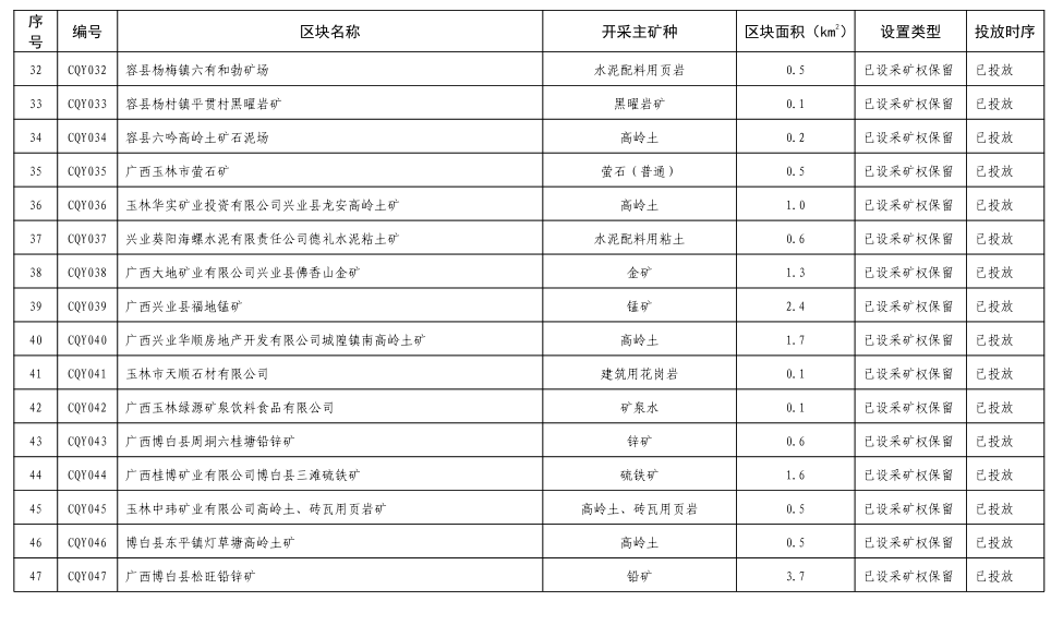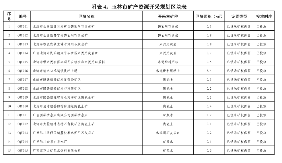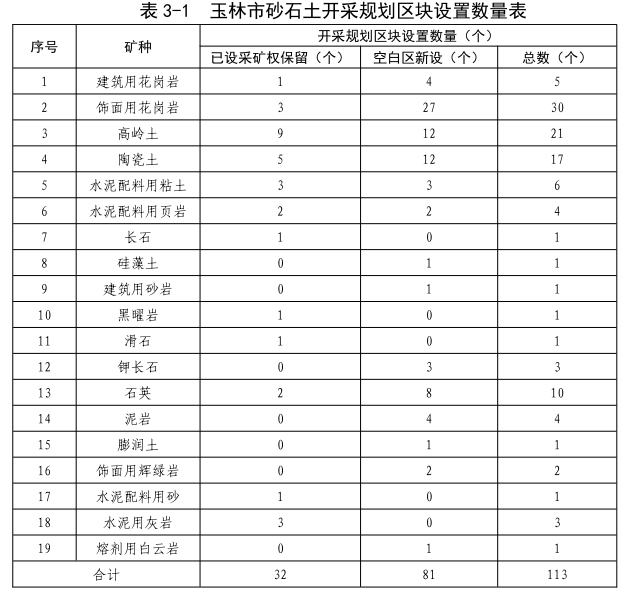 根据开采规划区块设置原则,玉林市本级共划分了砂石土开采规划区块113个,其中已设采矿权保留区块32个,新设砂石土开采规划区块81个,均位于集中开采区外,涉及的矿种主要为建筑用花岗岩、饰面用花岗岩、高岭土、陶瓷土、水泥配料用粘土、石英、泥岩等,各主要矿种的开采规划区块设置数量详见表3-1。