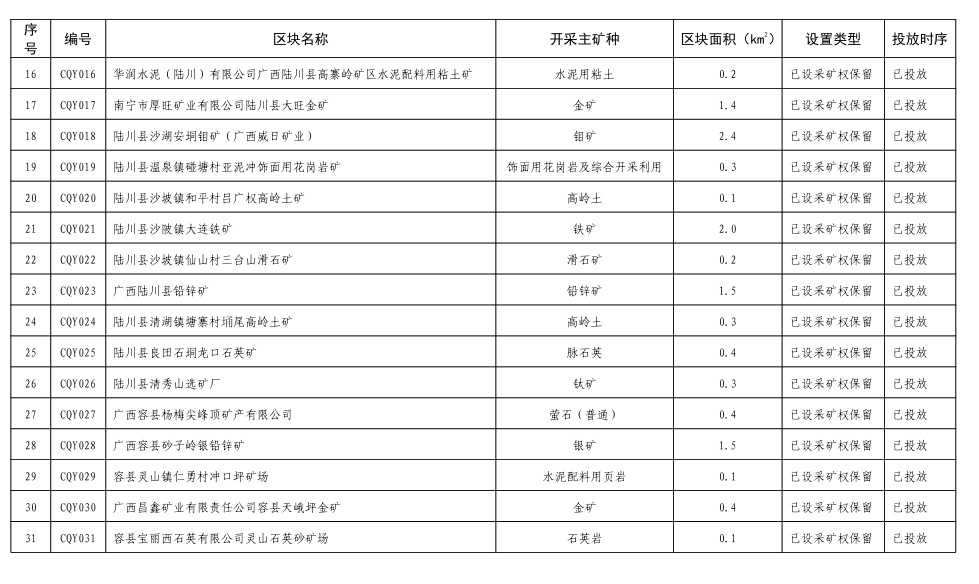 11.陆川沙坡高岭土、陶瓷土集中开采区(CS011):位于陆川沙坡镇,面积9.7平方公里,出露地层为白垩纪斑状黑云二长花岗岩(Kγ1),原岩风化后,形成丰富的高岭土资源,现有采矿权0个,规划设置采矿权3个;新设高岭土、陶瓷土矿山最低开采规模为10万吨/年,促进高岭土资源规模化、规范化利用。