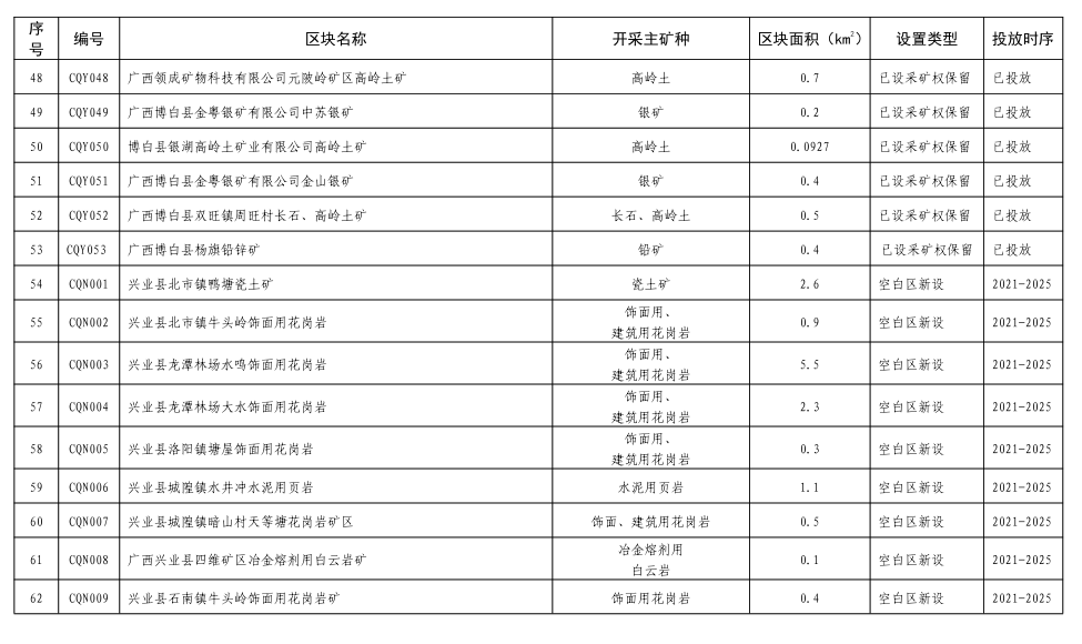 9.博白那卜花岗岩集中开采区(CS009):位于博白那卜镇,面积6.0平方公里,出露中细粒二长花岗岩(Sgγ2、Sgγ1),花岗岩资源丰富,现有采矿权4个,规划设置采矿权8个;该区新设饰面用花岗岩矿山最低开采规模为20万m3/年,已有矿山要逐步调整达到此规模;严格准入条件管理,促进花岗岩资源规模化、规范化利用。
