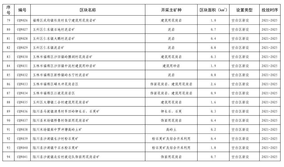 12.陆川古城建筑用花岗岩集中开采区(CS012):位于陆川古城镇,面积7.7平方公里,出露中细粒二长花岗岩(Sgγ2、Sgγ1)、天堂山岩群变粒岩(Pt1T),具有丰富的花岗岩资源,现有采矿权3个,规划设置采矿权3个;通过整合、扩大矿区范围等,该区新设建筑用花岗岩矿山最低开采规模为40万m3/年;严格准入条件管理,促进花岗岩资源规模化、规范化利用。