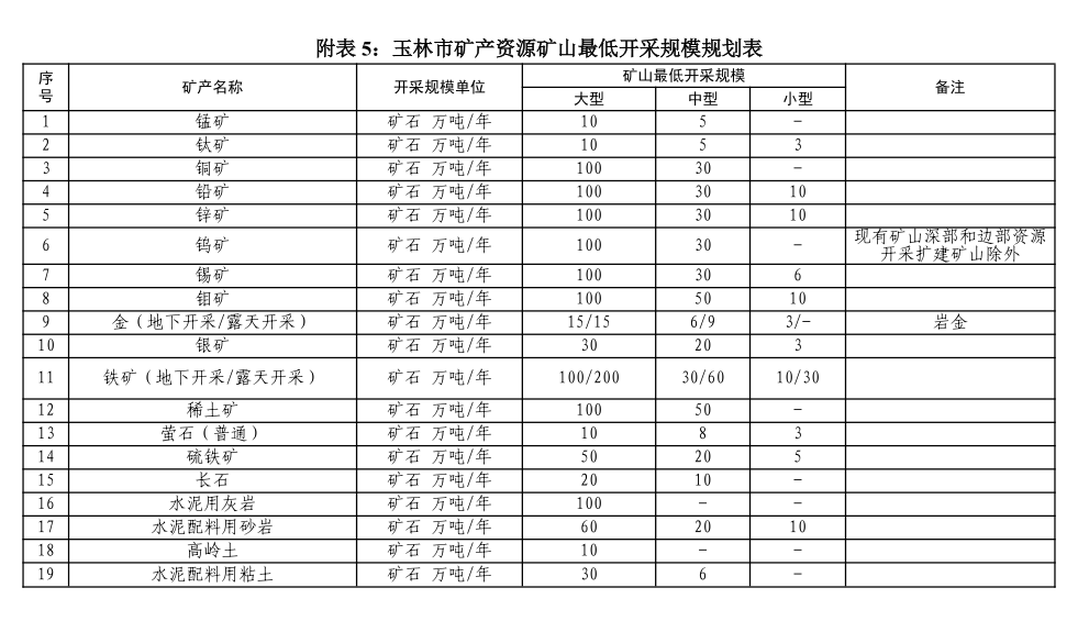 不再新建设计开采规模50万吨/年以下稀土矿、10万吨/年以下高岭土矿(陶瓷土矿)、3万立方米/年(荒料量)以下饰面用石材、100万吨/年以下建筑用砂石矿、100万吨/年以下水泥用灰岩矿、13万吨/年以下砖瓦用页岩矿、10万吨/年以下石英岩矿、10万吨/年以下水泥配料用页岩矿、6万吨/年以下水泥配料用粘土矿、10万吨/年以下长石矿山;其他矿种矿山最低开采规模与自治区规划保持一致。不再新批大型生产规模以下碳酸钙矿山;对超过一年未实际动用本矿山资源量的砖瓦用页岩矿山予以注销;对于停产超过一年的砂石矿山应限期整改,未在规定时间内完成整改的限期退出、予以注销。
