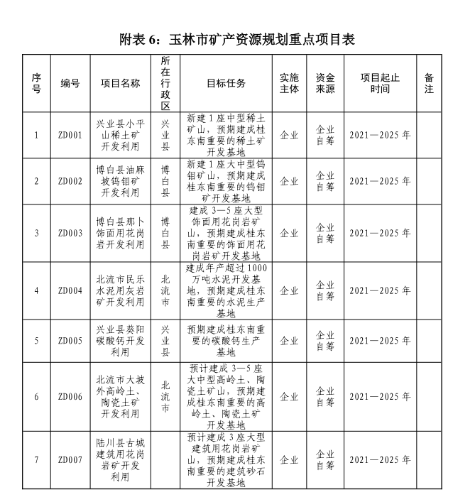 规划期间,落实自治区矿规中重点项目的部署和要求,结合玉林市的优势矿种,共开展7项矿产资源重点开发项目,推进矿产资源开发基地建设。