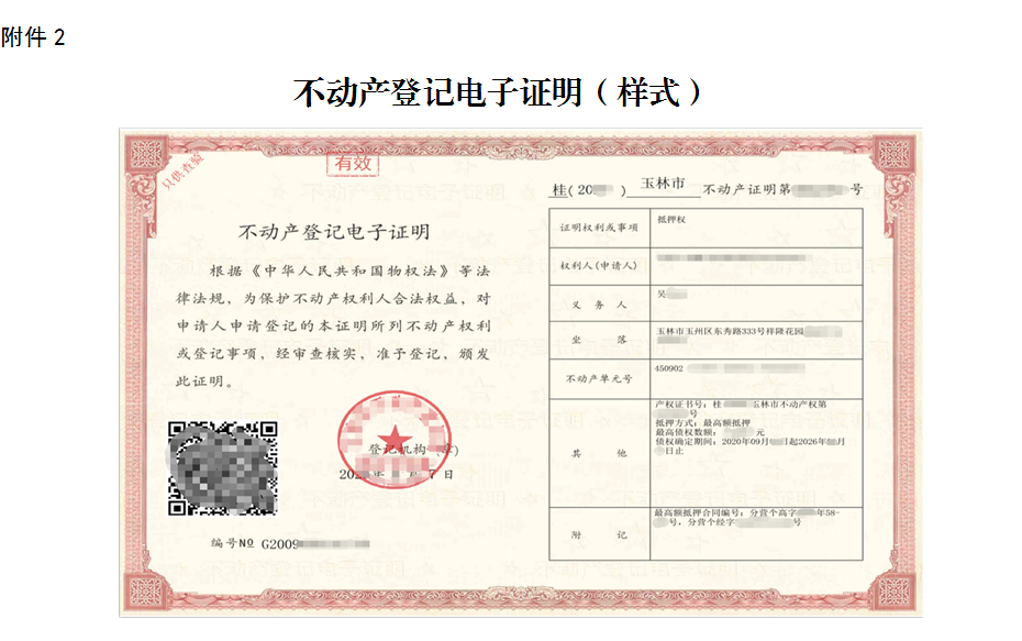 (二)不动产登记电子证明。不动产登记电子证明采用电子格式,记载事项与自然资源部(原国土资源部)监制的《不动产登记证明》记载事项保持一致(样式详见附件2)。