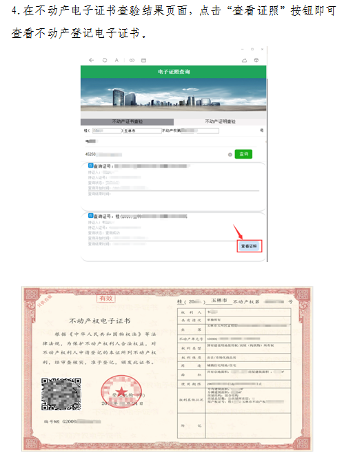 1.玉林市不动产登记中心微信公众号。搜索并关注玉林市不动产登记中心微信公众号—业务办理—电子证照查询—个人中心—我的证照—点击选中不动产证书查验或不动产证明查验,按要求输入相关信息进行查询。