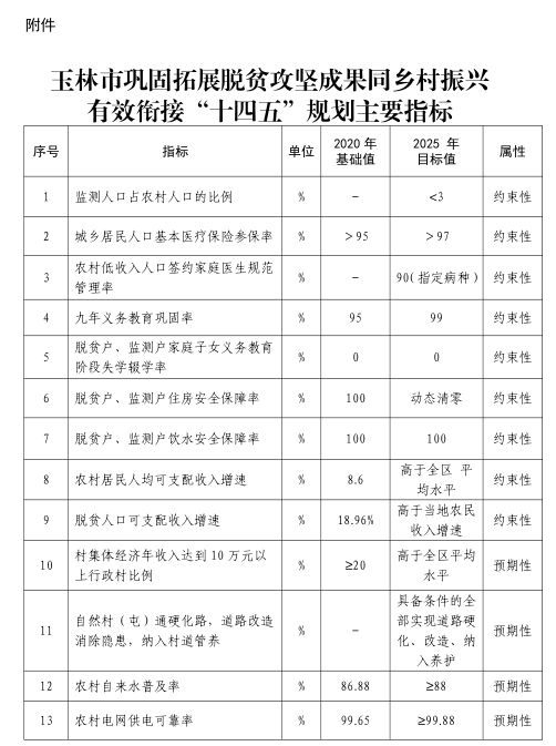 附件:玉林市巩固拓展脱贫攻坚成果同乡村振兴有效衔接“十四五”规划主要指标