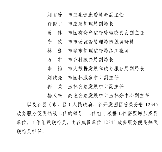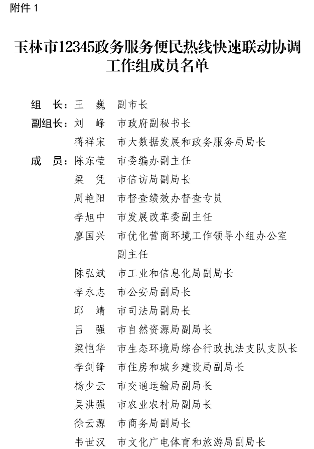 1.玉林市12345政务服务便民热线快速联动协调工作组成员名单