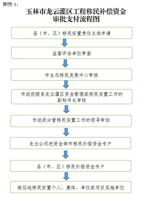 移民补偿资金审批支付流程:县(市、区)移民安置责任主体申请→监督评估单位审查→市生态移民发展中心审核→市政府联系龙云灌区资金管理或移民安置工作的副秘书长审核→市政府分管移民安置工作的领导审批→市生态移民发展中心向龙云公司申请→龙云公司把资金转市移民补偿资金专户→县级移民安置补偿资金专户→被征地移民安置个人、集体、单位或项目实施单位。