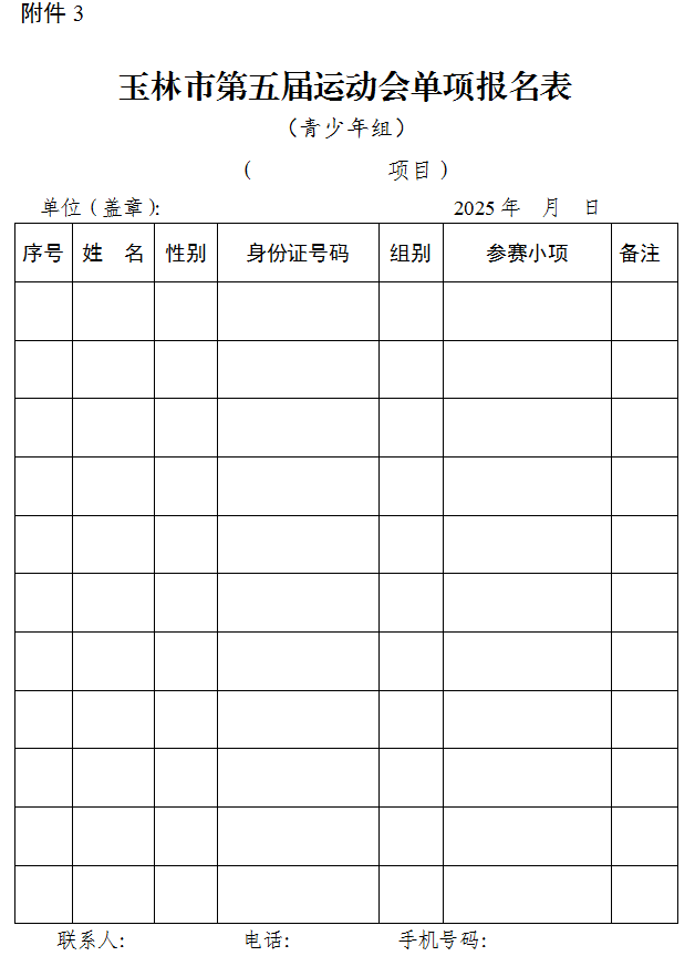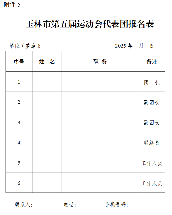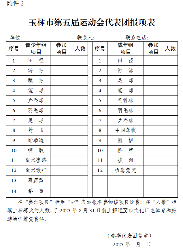 (一)第一次报名:各参赛代表团于2025年8月31日前将《玉林市第五届运动会代表团报项表》加盖公章报送至市文化广电体育和旅游局训练竞赛科。