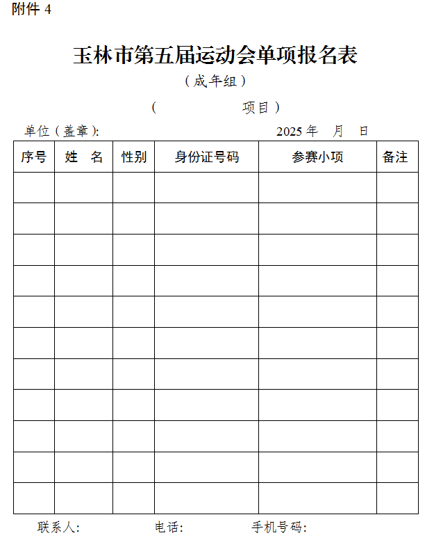 (二)第二次报名:各参赛代表队于赛前20天将《玉林市第五届运动会单项报名表》加盖公章报送至市文化广电体育和旅游局训练竞赛科(青少年组)或群众体育科(成年组)。报名后不得无故更改。