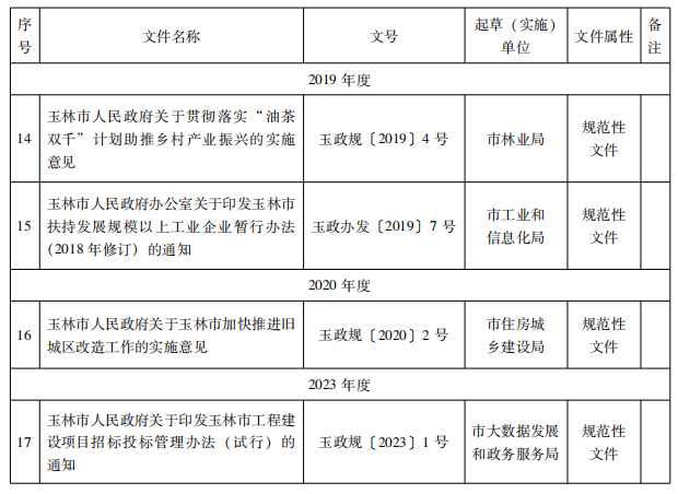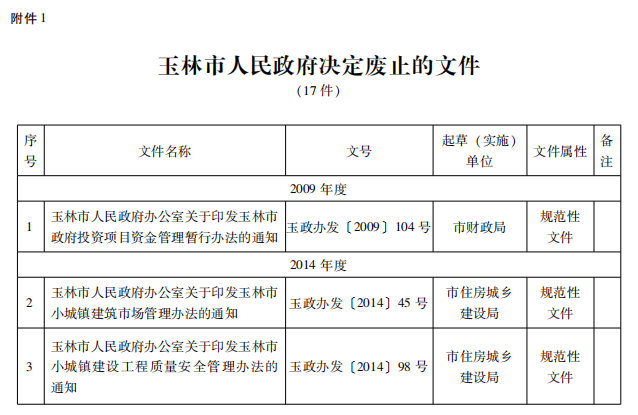 一、对17件玉林市人民政府文件予以废止,凡废止的文件停止执行,不再作为行政管理的依据。