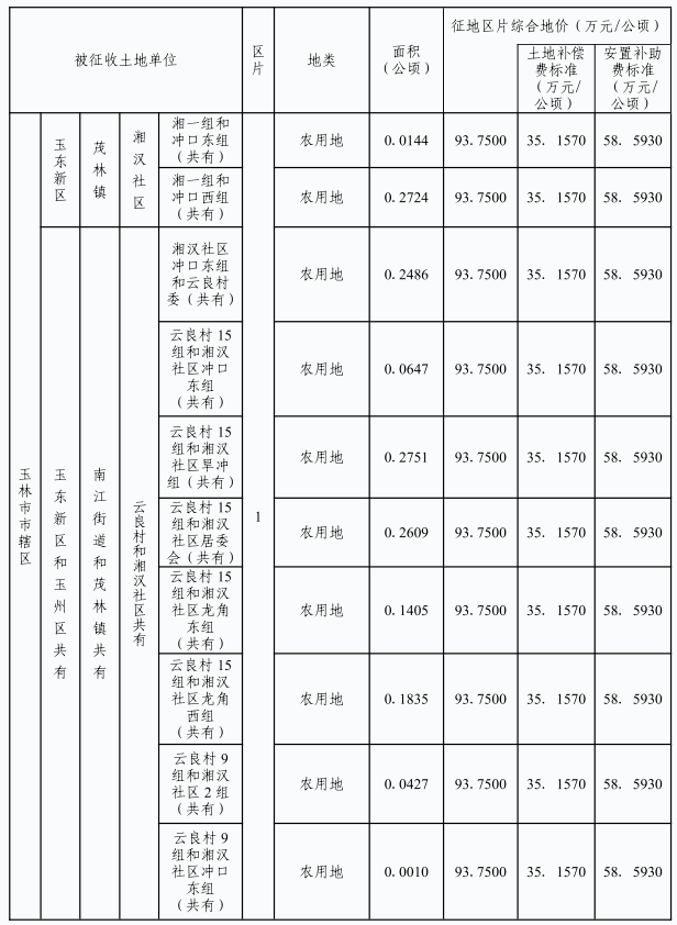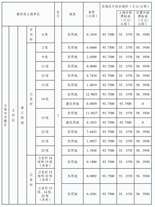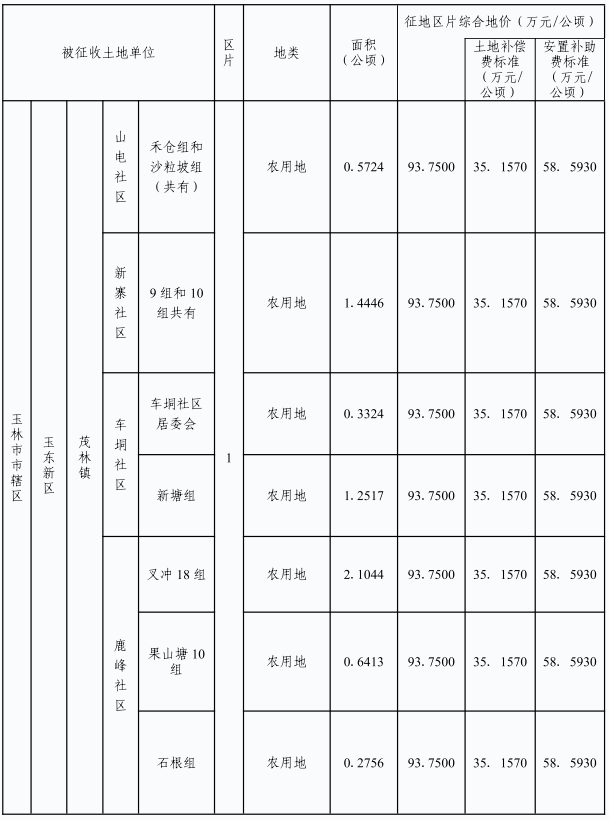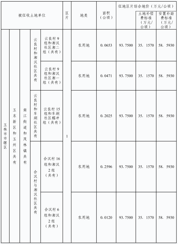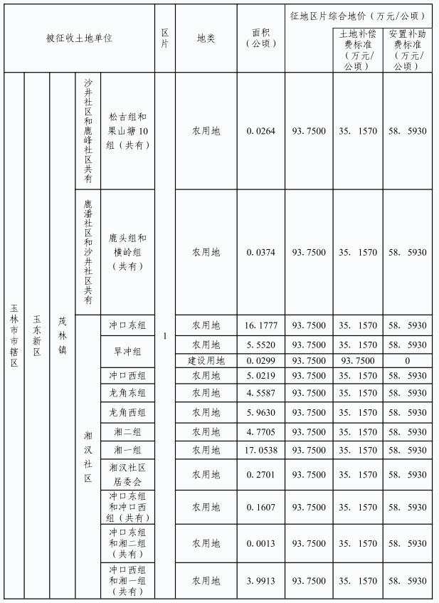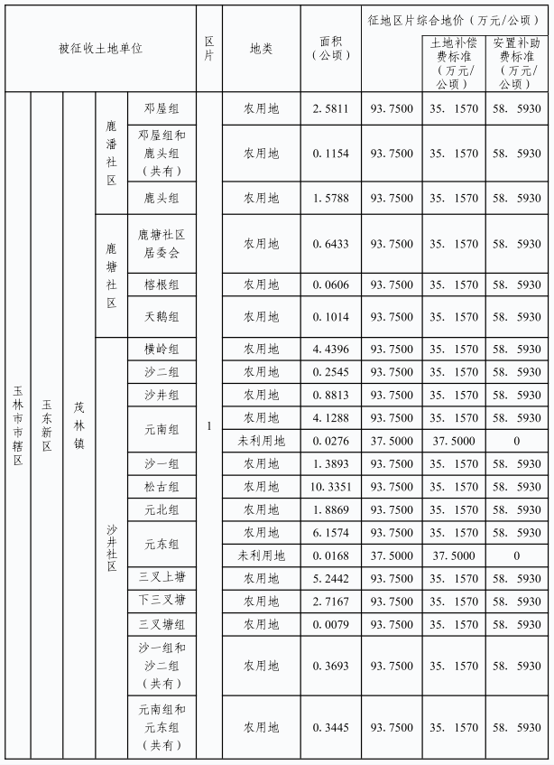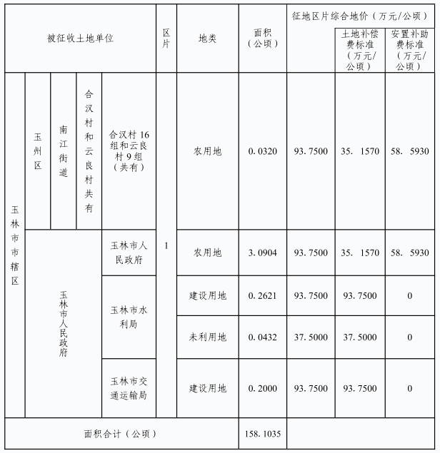玉林市市辖区茂林镇山电社区、新寨社区、车垌社区、鹿峰社区、鹿潘社区、鹿塘社区、沙井社区、湘汉社区,南江街道合汉村、云良村的部分集体土地,拟征收土地面积约 154.5078公顷;同时使用玉林市人民政府、玉林市交通运输局、玉林市水利局的国有土地 3.5957公顷,合计总面积 158.1035公顷。