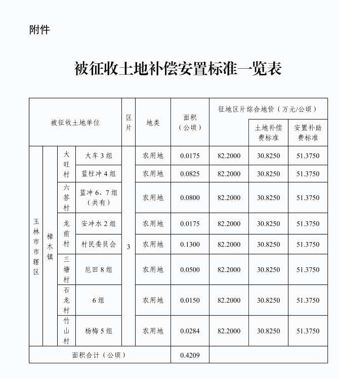 玉林市市辖区樟木镇大旺村大车 3组、蓝柱冲 4组,六答村蓝冲 6、7组,龙前村村民委员会及安冲水 2组,三塘村厄田 8组,石龙村 6组,竹山村杨梅 5组,合计征地面积 0.4209公顷(约 6.3135亩)。