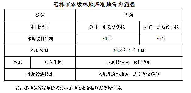 林地基准地价是根据政府需求对林地不同级别或不同均质地域,正常市场水平(平均利用水平和生产力水平)及平均基础设施条件下,在估价期日2023年1月1日,承包经营年期30年的集体土地承包经营权价格,使用年期50年的国有土地使用权价格。