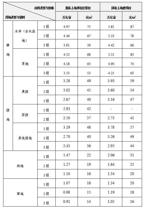 (三)成果具有确定性和唯一性。本次耕地园地林地草地级别、基准地价成果都是直接对应于土地利用现状中的耕地、园地、林地、草地图斑,并非为一定范围内的连片区域,因此,倘若后期某一地块改变了土地利用类型(与本次基准地价成果对应的地类相比),改变后的地类不能沿用改变前的地类的级别。