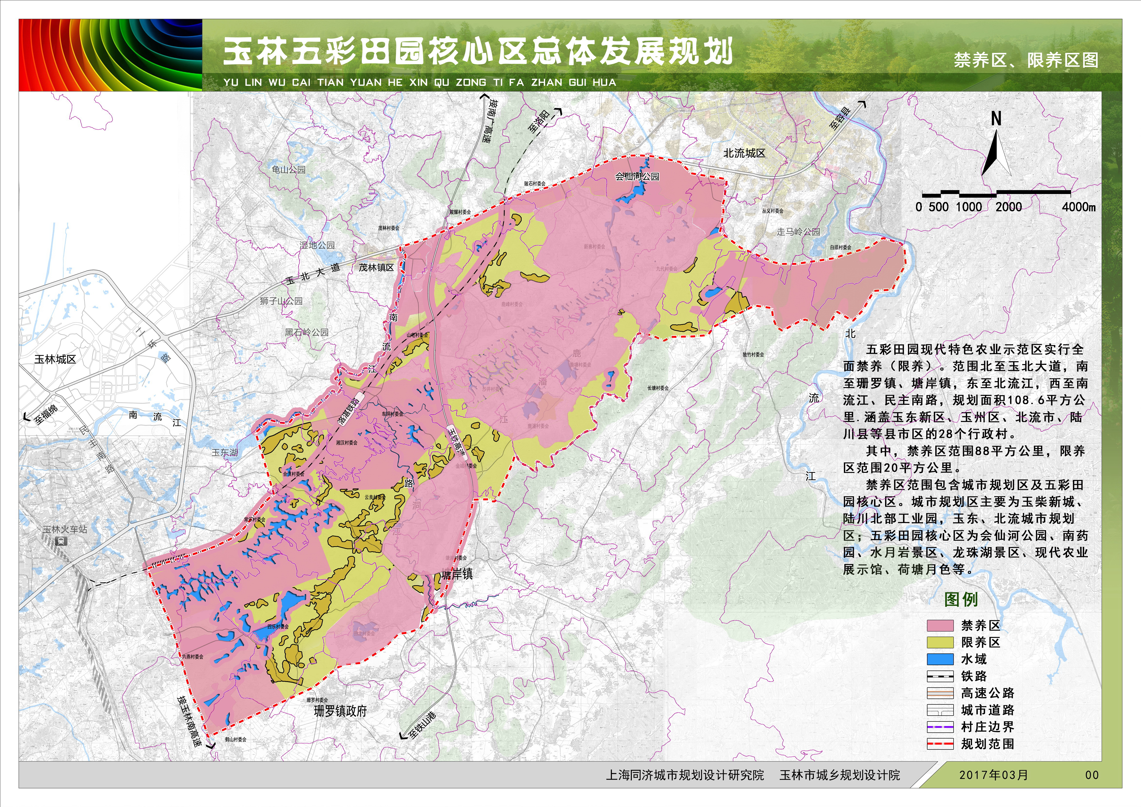 “五彩田园”示范区北至玉北大道,南至珊罗镇、塘岸镇,东至北流江,西至南流江、民主南路,规划面积108.6平方公里。涵盖玉东新区、玉州区、北流市、陆川县等县(市、区)的28个行政村。“五彩田园”示范区实行全面禁养(限养),其中,禁养区范围88平方公里,限养区范围20平方公里(详见附图)。禁养区范围包含城市规划区及“五彩田园”核心区。城市规划区主要为玉柴产业新城、陆川县工业园区、玉东新区、北流城市规划区部分区域;“五彩田园”核心区为会仙河公园、南药园、水月岩景区、龙珠湖景区、现代农业技术展示馆、荷塘月色等。