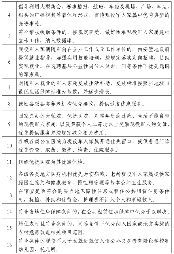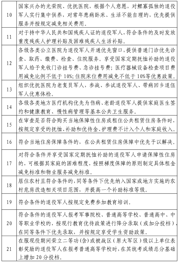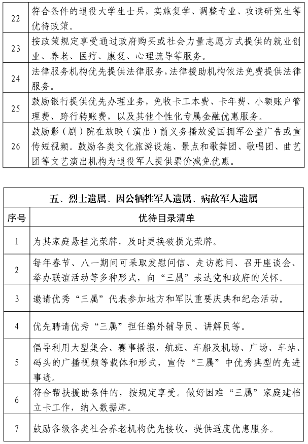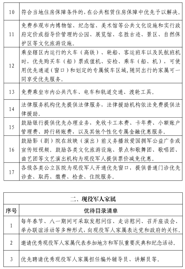 根据《退役军人事务部等20部门关于加强军人军属、退役军人和其他优抚对象优待工作的意见》(退役军人部发〔2020〕1号)和《广西壮族自治区退役军人事务厅等25部门关于印发〈广西加强军人军属、退役军人和其他优抚对象优待工作实施方案〉 的通知》(桂退役军人发〔2020〕120号)精神,为做好我市加强军人军属、退役军人和其他优抚对象优待工作,结合我市实际,补充以下六条优待措施,并制定我市基本优待目录清单,请按照文件要求抓好落实。