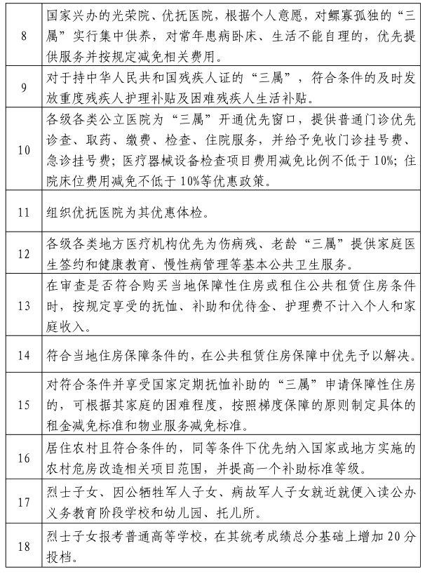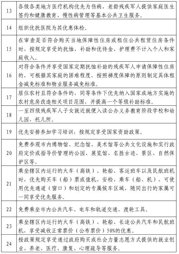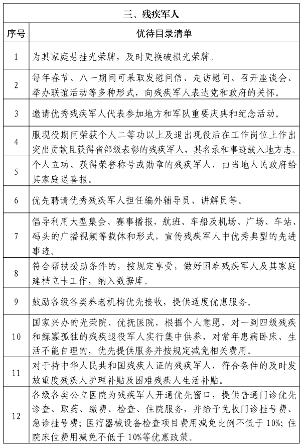 三、各级各类公立医院为享受抚恤补助的优抚对象开通优先窗口,提供普通门诊优先诊查、取药、缴费、检查、住院服务,并给予免收门诊挂号费、急诊挂号费;医疗器械设备检查项目费用减免比例不低于10%;住院床位费用减免不低于10%等优惠政策。〔责任单位:市卫生健康委,各县(市、区)人民政府〕
