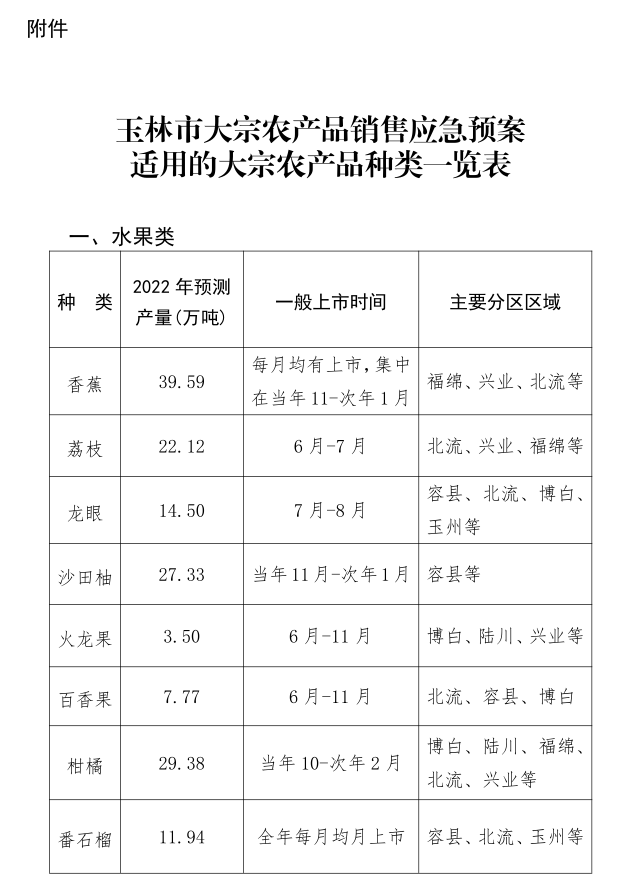 附件:玉林市大宗农产品销售应急预案适用的大宗农产品种类一览表