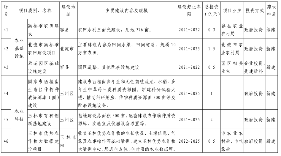 (一)粮食产业。按照绿色、高产、优质、生态、安全的要求,推进粮食规模化、产业化发展,着力打造广西粮食主产区和优质稻高产示范区。在保持粮食播种面积基本稳定的基础上,重点推进商品粮生产基地建设,高标准推进农业农村部万亩高产示范片、隆平高科百亩连片超高产示范片和玉林市粮食生产现代化示范片建设;全市推进高标准农田建设,优化粮食品种结构,大力发展优质谷、优质玉米生产,积极发展无公害、有机和地理标志粮食产品,推广高产杂交稻,多措并举稳定粮食产量;充分利