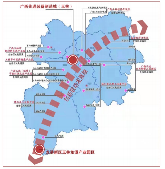 广西先进装备制造城(玉林)。重点发展机械制造、内燃机产业、新能源汽车产业、智能制造产业、军民融合产业、节能环保、商贸物流等产业。