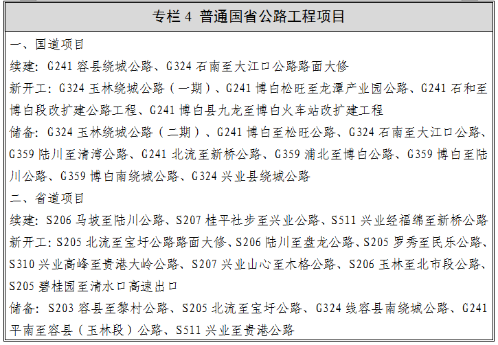 全面落实《广西高速公路网规划(2018-2030年)》。一是高效率形成玉北环城高速,支撑玉北同城化发展。建设北流至化州宝圩高速(广西段)、梧州至玉林至钦州高速(灵山至塘岸段),实现环城高速闭环,有效分流过境交通,支撑玉北同城化发展。二是高水平打通“两湾”联动高速大动脉。重点建设岑溪至大新高速(玉林至横县段)、岑溪至大新高速(粤桂界至玉林段)、南宁至湛江高速(南宁至博白那卜段)、全州至容县公路(容县至信宜(广西段)、北流至化州宝圩高速及岑溪至大新公路(荔玉路共线段扩容工程)等项目,加快建设博白至遂溪高速(广西段)、博白至高州高速(广西段)等项目,形成对接广东的多通道高速公路格局。三是高标准衔接相邻地市,有效缩短城市群出行时间。加快全州至容县公路(平南至容县段)、梧州经玉林至钦州高速(苍梧至容县段)、贵港经兴业至博白高速、贵港至岑溪公路及玉林至浦北高速等项目建设。