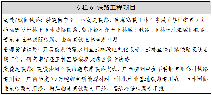 铁路专用线进园区工程。加快建设广西柳钢中金不锈钢有限公司铁路专用线、广西华友70万吨锂电新能源材料一体化产业基地铁路专用线、玉林国际陆港铁路专用线,谋划建设塘岸物流园铁路专用线及福达冷链铁路专用线,依托龙潭产业园区、先进装备制造城、陆川北部工业园及塘岸综合智慧物流园打造公铁联运的陆港型物流枢纽。