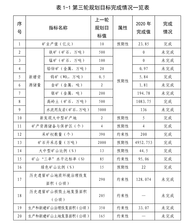 《玉林市矿产资源总体规划(2016~2020年)》(以下简称第三轮规划)实施以来,玉林市矿产资源勘查开发布局得到了进一步优化,矿产资源保障能力得到了提高,矿产资源合理开发利用与保护水平得到了提升,矿山生态环境得到了改善,绿色矿山建设取得新成效,矿产资源管理得到进一步完善,主要完成指标情况详见表1-1。