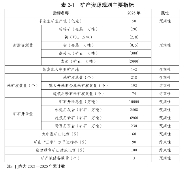 重点发展建筑砂石、饰面用花岗岩、灰岩、高岭土等优势矿业,优化矿产业新布局,矿石开采量预期达1亿吨,矿产及其加工产业总产值达到50亿元左右。