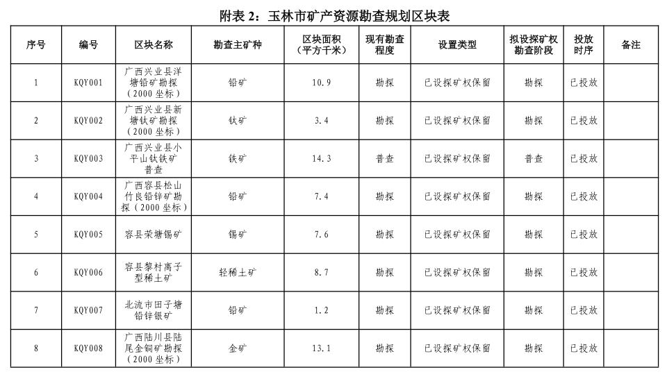 依据耕地和永久基本农田、生态保护红线、城镇开发边界“三条控制线”的管控要求,统筹考虑玉林市环境承载能力、矿产资源禀赋、产业布局等因素,以多金属、稀土矿产为勘查重点,划定了2处重点勘查区。