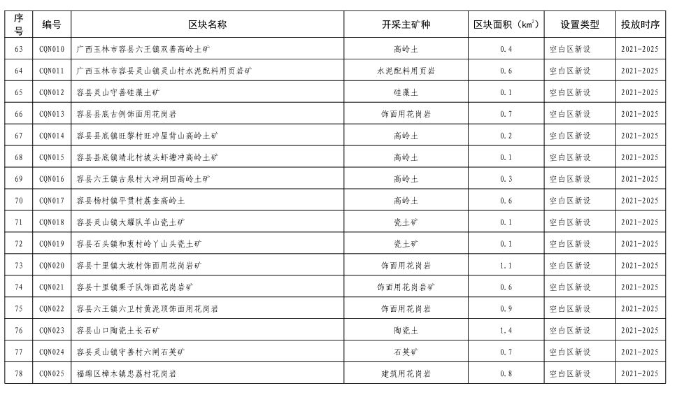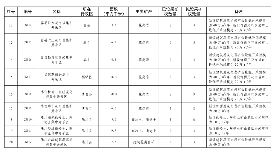 6.容县杨村花岗岩集中开采区(CS006):位于容县杨村镇,面积4.75平方公里,出露片麻状细粒二长花岗岩(Dgγ2)、中细粒二长花岗岩(Cγ3),花岗岩矿产资源丰富,现有0个采矿权,规划设置采矿权3个;该区新设建筑用花岗岩矿山最低开采规模为40万m3/年,新设饰面用花岗岩矿山最低开采规模为20万m3/年;严格准入条件管理,促进花岗岩资源规模化、规范化利用。