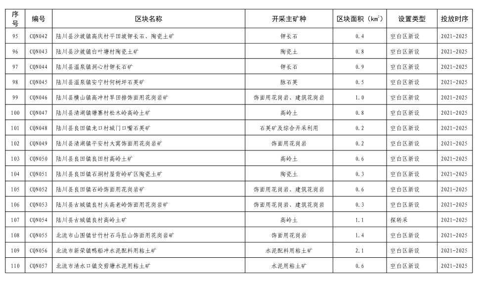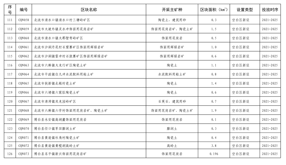 根据开采规划区块设置原则,玉林市本级共划分了砂石土开采规划区块113个,其中已设采矿权保留区块32个,新设砂石土开采规划区块81个,均位于集中开采区外,涉及的矿种主要为建筑用花岗岩、饰面用花岗岩、高岭土、陶瓷土、水泥配料用粘土、石英、泥岩等,各主要矿种的开采规划区块设置数量详见表3-1。