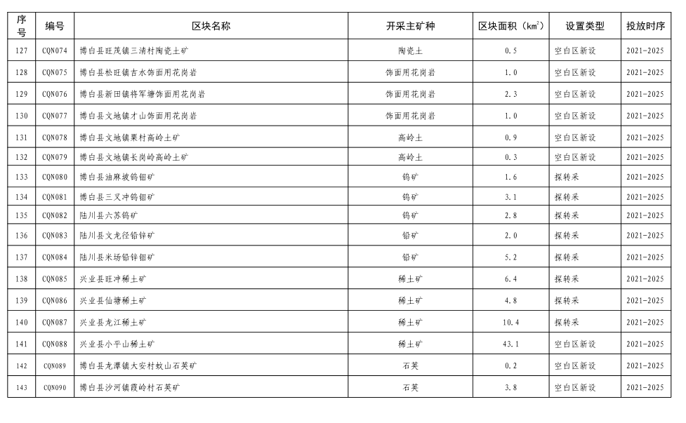 9.博白那卜花岗岩集中开采区(CS009):位于博白那卜镇,面积6.0平方公里,出露中细粒二长花岗岩(Sgγ2、Sgγ1),花岗岩资源丰富,现有采矿权4个,规划设置采矿权8个;该区新设饰面用花岗岩矿山最低开采规模为20万m3/年,已有矿山要逐步调整达到此规模;严格准入条件管理,促进花岗岩资源规模化、规范化利用。