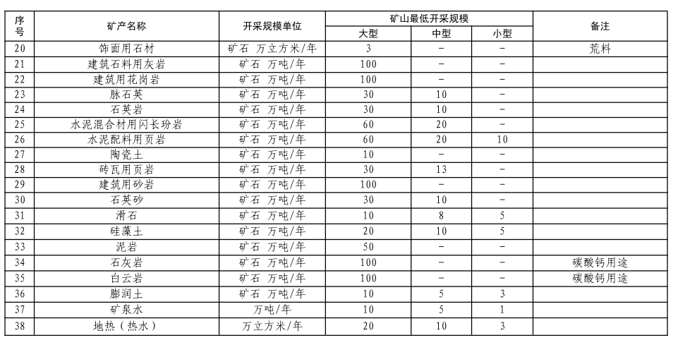 不再新建设计开采规模50万吨/年以下稀土矿、10万吨/年以下高岭土矿(陶瓷土矿)、3万立方米/年(荒料量)以下饰面用石材、100万吨/年以下建筑用砂石矿、100万吨/年以下水泥用灰岩矿、13万吨/年以下砖瓦用页岩矿、10万吨/年以下石英岩矿、10万吨/年以下水泥配料用页岩矿、6万吨/年以下水泥配料用粘土矿、10万吨/年以下长石矿山;其他矿种矿山最低开采规模与自治区规划保持一致。不再新批大型生产规模以下碳酸钙矿山;对超过一年未实际动用本矿山资源量的砖瓦用页岩矿山予以注销;对于停产超过一年的砂石矿山应限期整改,未在规定时间内完成整改的限期退出、予以注销。