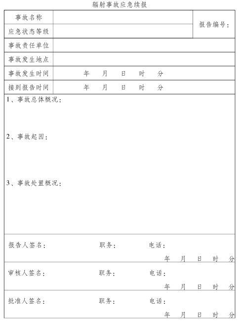 (1)初报。即在发现事故后立即电话上报,随后报送书面报告。主要内容包括:辐射事故发生的时间、地点、原因以及人员受害情况、事件潜在危害程度等初步情况(辐射事故应急初报模板详见附件5)。