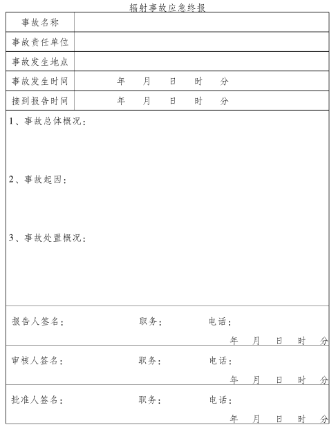 (3)终止报告。即在事故处理完毕后采用书面报告形式及时上报。主要内容包括:处理事故的措施、过程、结果和遗留问题;事故潜在或间接危害、社会影响,有关危害与损失的证明文件等详细情况(辐射事故应急终报模板详见附件5)。