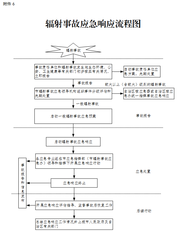 发生一般辐射事故时启动Ⅳ级响应,立即报告市人民政府和自治区生态环境厅,由市辐射应急指挥部统一领导和组织实施,自治区核应急办予以指导、支持,主要程序为:
