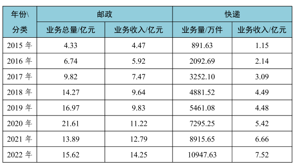 表1-1 玉林市2015-2022年邮政快递业发展情况