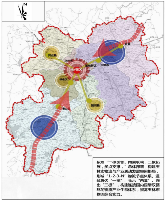 在玉林市构建以现代物流发展核心区、物流园区、物流中心和配送中心四个层次节点设施建设为重点的“一核引领,两翼联动,三极拓展,多点支撑”物流业空间布局,打造“多向联通”国内物流主通道和“一纵一横”Y字型国际物流大通道,构建物流与产业联动发展空间格局,形成“1-2-3-N”物流节点体系。其中,“1”即“一核引领”,是指玉州区和玉东新区——现代物流发展核心区;“2”即“两翼联动”,其中“北翼”以北流市和容县为主体,“南翼”以博白县和龙潭新区为主体;“3”即“三级拓展”,是指三个现代物流发展重要增长极——兴业县、陆川县和福绵区;“N”即为玉林市重要物流节点。