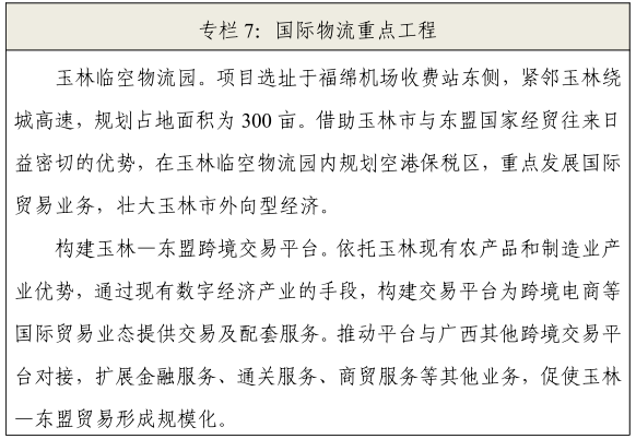 南向国际物流通道由玉林经钦北防,连接东盟各国,打通面向北部湾、广东湛江和海南周边港口及中国—东盟经济走廊的通道,对接西部陆海新通道和海上丝绸之路。加快推动玉林至北海城际铁路规划建设;建成松旺至铁山港东岸高速公路,增强玉林与东盟地区的物流往来。