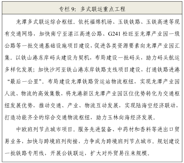 优化综合交通物流节点空间布局。在玉林主城区、各县(市)区、重点镇建设一批综合交通场站,实现火车站、汽车客运站、公交汽车站、机场的无缝对接;加快完善海运交通体系,实现海铁联运;打造民用航空重要节点,加快融入长三角、珠三角航空网络体系;统筹推进一批货运站场和配套设施项目建设,构建公铁水航联动,打造布局合理全面的综合交通物流枢纽。