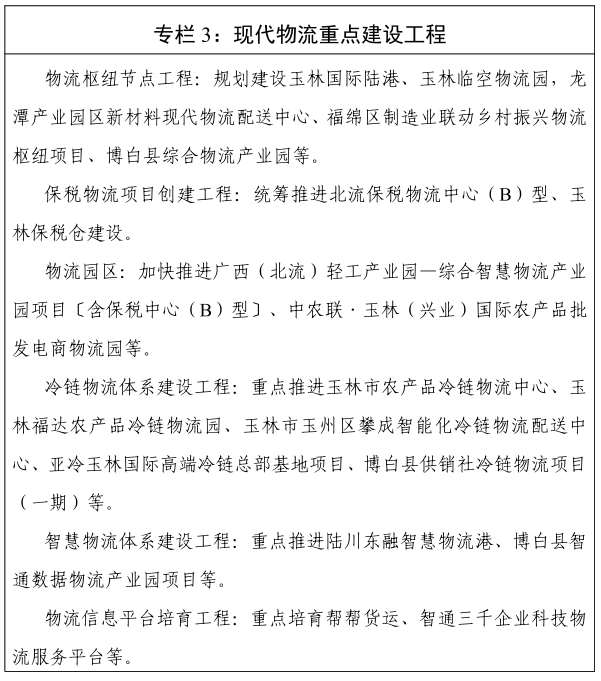 1.构建高能级服务业载体平台。围绕全市现代服务业发展重大需求,打造一批具有较强影响力、标志性的现代服务业重点载体平台。支持在现代物流、现代商贸、商务服务、大数据、新材料、新能源、中医药(香料)等产业领域,建设一批国家级、自治区级专业化服务经济平台,为现代服务业发展提供有效支撑。加快推进玉林数字经济城、中国—东盟(玉林)中药材交易市场、玉林国际香料交易中心暨玉林福达农产品冷链物流园等载体平台建设,积极推进玉林国际陆港、玉林(福绵)生态纺织服装产业园、玉林保税物流中心(B型)、大湾区中医药物流配送中心建设。