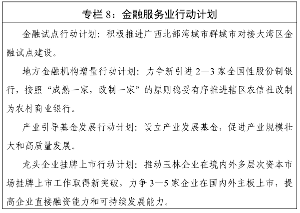 (六)打造总部经济。支持龙头企业兼并重组,加强产业链价值链的整合与拓展能力,形成一批具有强大竞争力的现代服务业集团。引导支持本土企业总部“走出去”,向市内外城市功能区、产业集聚区、特色小镇等高端产业平台集聚,着力提升企业发展能极和经济承载能力,做大做强企业总部。大力引进市外企业总部在玉林设立地区总部、分支机构,力争引进总部设在玉林的企业6家以上。