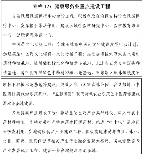 (三)打造中医药服务“玉林名片”。健全中医医疗服务体系,积极争创区域中医医疗中心,全面推进二级中医医院标准化建设,推进县域中医类医院基础设施提档升级,鼓励社会办医疗机构及康复、护理等机构建设,鼓励有资质的中医专业技术人员特别是名老中医开办中医诊所。发挥“中国南方药都”品牌效应,加快推进中医药科研和创新,促进玉林市中医医院、玉林市中西医结合骨科医院中药壮瑶药制剂中心提档升级。推动中医药与养老融合发展,支持中医医疗机构和社区卫生服务中心及乡镇卫生院适当划出一定的区域,谋划拓展养老、护理、安宁疗护等相关服务。不断扩大中国(玉林)中医药博览会影响力,实施中医药文化传播行动,到2025年,公民中医药健康文化素养水平提高到25%以上。