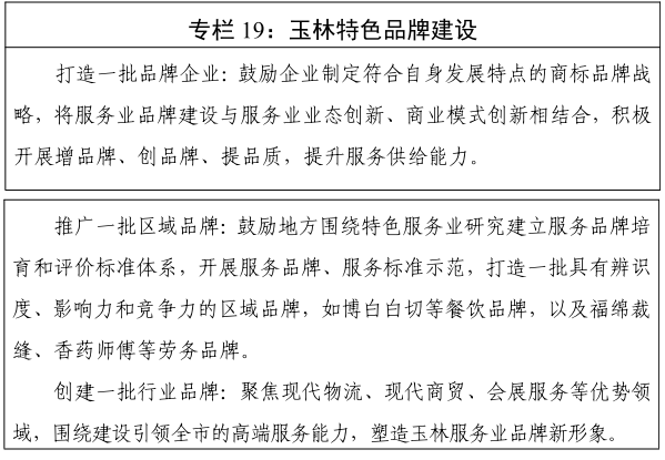 1.打造服务行业品牌。发挥玉林养生养老服务、托育服务、家政服务的基础优势,推动在养老、育幼、家政等领域培育若干特色鲜明的服务品牌,在全区范围内加强品牌输出。发展现代物流、科技服务、商务服务等生产性服务业品牌,加强培育数字产业、电子商务、人力资源等服务业品牌,建设具有玉林人文、地域特色的区域性知名品牌,形成一批在广西乃至全国有影响力的服务品牌,全面提升玉林服务业品牌的认知度和影响力。