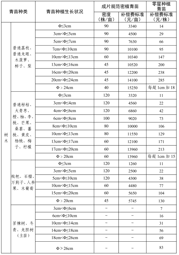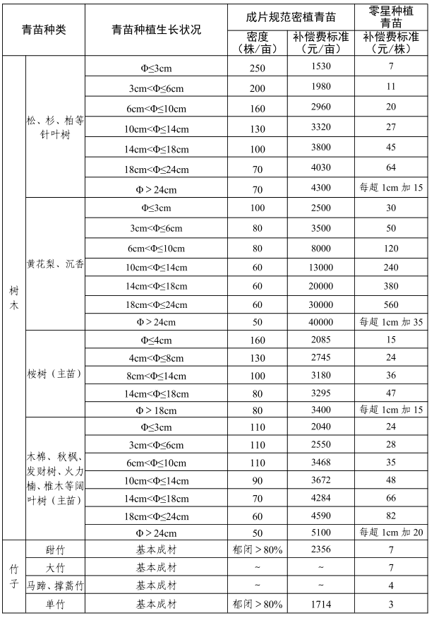 注:(1)表中符号“Φ”代表苗木主干直径,果树苗木在高于正常种植地面5cm处量取;其它苗木在高于正常种植地面130cm处量取。